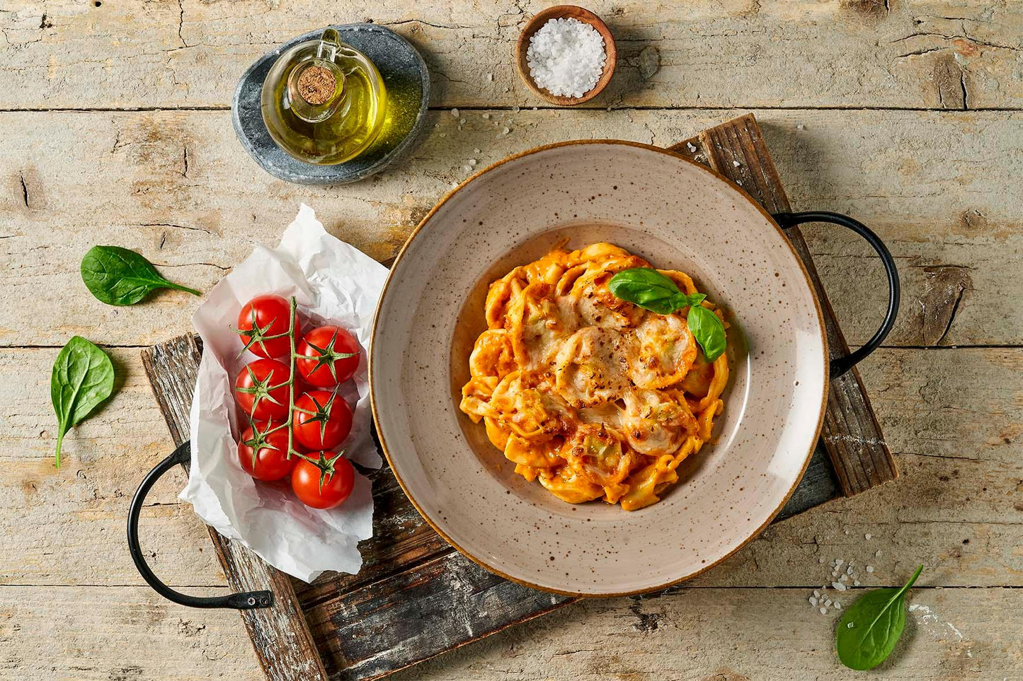 Tortellini mit Ricotta-Spinatfüllung* gegart (43%) (Wasser, HARTWEIZENGRIEß*, Molkeneiweißkäse Ricotta* (6%) (SÜßMOLKE*, MILCH*, Speisesalz), Spinat*, WEIZENMEHL*, Kartoffeln*, HÜHNEREI*, Rapsöl*, WEIZENPROTEIN*, jodiertes Speisesalz (Speisesalz, Kaliumiodid), Gewürze*, Reismehl*, Hefe*, Kräuter*, Meersalz, Olivenöl*, Zucker*), Tomaten*, KÄSE* (5%), Tomatenmark*, SAHNE*, Zwiebeln*, CREME FRAÎCHE*, Maisstärke*, Rohrzucker*, WEIZENMEHL*, natürliches Aroma, Karotten*, Lauch*, Kräuter*, Gewürze*, Pastinake*. *aus kontrolliert biologischer Landwirtschaft"