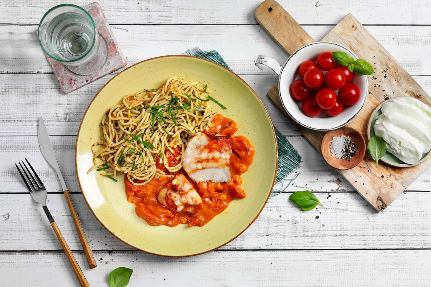 Fisch als wertvolle Proteinquelle darf als Teil einer ausgewogenen Ernährungsbalance natürlich nicht fehlen. Darum haben wir die Fit-Box mit unserem Gegrillten Fischfilet ergänzt: Hier trifft eine aromatische Alaska-Seelachsschnitte auf feines Tomaten-Gemüseragout, verfeinert mit Kräutern und Weißwein, sowie auf unser hauseigenes Kartoffelgratin. Auch Hähnchenfleisch gilt unter Sportlern als Lebensmittel, das diverse Vorteile verbindet: Reich an Eiweiß und im Vergleich zu anderen Fleischsorten vergleichsweise arm an Fett, übernimmt es in der ausgewogenen Ernährung eine wichtige Funktion. Darum findest Du in der Fit-Box zum einen die Hähnchenbrust „Caprese“ in fruchtiger Tomatensoße mit Mozzarella und Kräuter-Nudeln, und zum anderen das Hähnchen „Swiss Style“ in hausgemachter Pfeffer-Käsesoße mit Kartoffelpüree und knackigem Brokkoli. Freu Dich außerdem auf unsere köstliche Pasta-Spezialität Gnocchi à la caprese mit leichter Basilikumsoße, süßen Cherry-Tomaten und Mozzarellawürfeln. Bella Italia!