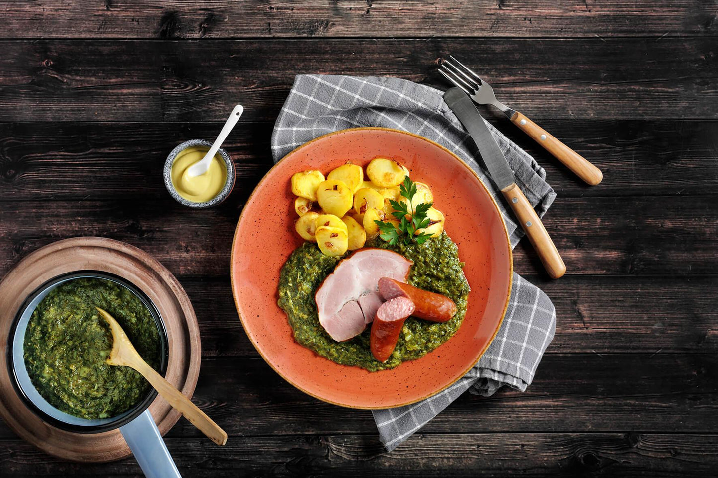 Grünkohl wird üblicherweise während der kalten Monate des Jahres geerntet, was ihm vor allem in den nördlichen Teilen Deutschlands den Ruf einer gern verwendeten Menü-Zutat eingebracht hat. HOFMANNs greift diese Tradition aus Niedersachsen und Schleswig-Holstein auf und serviert Dir mit dem Grünkohl "Norddeutsche Art" einen schmackhaften Klassiker in Form eines hochwertigen Tiefkühlgerichts. Herzhafter Grünkohl mit Speck trifft auf eine geräucherte, gekochte Bauernwurst, ein Stück Kasseler Nacken und hausgemachte Bratkartoffeln mit Zwiebeln – genau die richtige Mahlzeit, um neue Energie zu tanken, egal zu welcher Jahreszeit. Dich erwartet ein Tiefkühlgericht in Restaurantqualität, das wir von Hand für Dich zubereitet haben und den strikten Vorgaben unseres Reinheitsgebots entspricht. Überzeuge Dich selbst!