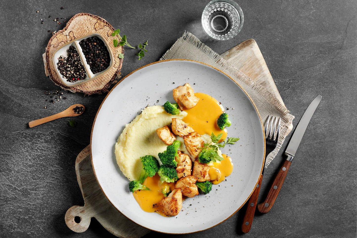 Zarte Hähnchenbrustfiletstücke treffen auf eine köstliche Pfeffer-Käsesoße, die zusammen eine herrliche Kombination mit alpinem Flair ergeben. Als passende Ergänzung haben sich die Spitzenköche bei HOFMANNs für knackige Broccoliröschen und herzhaftes Kartoffelpüree entschieden.