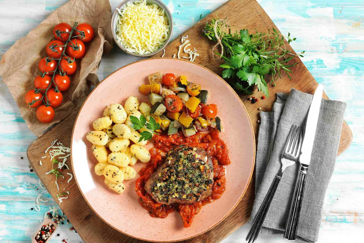 Mit diesem exquisiten Gericht zaubert HOFMANNs Dir ein einzigartiges Geschmackserlebnis auf den Teller: Das Lammhüftsteak "Mediterrane Art". Angelehnt an die kulinarischen Traditionen des Mittelmeerraumes, erwartet Dich ein würzig aromatisches Tiefkühlgericht in Spitzenrestaurant-Qualität. Das Hüftsteak vom Lamm haben wir für Dich zart angebraten und mit einer knusprigen Kräuterhaube versehen. Eine köstliche Tomatensoße und feines Ratatouille-Gemüse sorgen für fruchtige Akzente, während die geschmacksintensiven Rosmarin-Gnocchi die Gesamtkomposition hervorragend vollenden. Viele regionale Zutaten, liebevolle Zubereitung von Hand und kurze Lieferzeiten dank Expressversand – Was willst Du mehr? Füge das Lammhüftsteak "Mediterrane Art" gleich Deiner nächsten Bestellung hinzu!