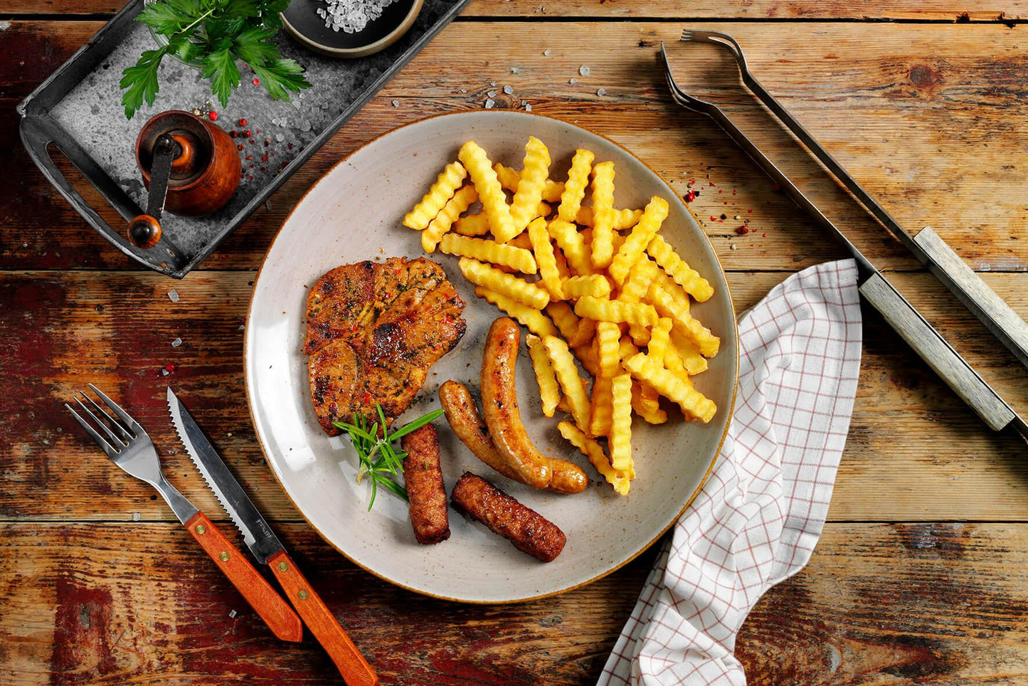 HOFMANNs zeigt Dir, wie vielseitig und lecker sich die Küchenklassiker aus unserem Angebot präsentieren: Den Anfang machen drei Premium-Fertiggerichte nach der Tradition der deutschsprachigen Küche, etwa unsere herzhaften Pfefferfrikadellen. Diese servieren wir Dir mit einer aromatischen Bratensoße, ganzen grünen Pfefferkörnern, grünen Bohnen, Salzkartoffeln und Röstzwiebeln – ein klassisch-würziger Genuss! Gleiches gilt für unsere Fränkischen Bratwürste mit deftigem Sauerkraut, Speck und Kartoffelpüree als weitere Vertreter der traditionellen Hausmannskost. Für alle Fleischliebhaber empfehlen wir vor allem auch die HOFMANNs Grillplatte. Bestehend aus einem zarten Schweinenackensteak in Kräutermarinade, zwei Bratwürsten nach Fränkischer Art und zwei kross angebratenen Cevapcici findest Du hier die feinsten Delikatessen aus unserer hauseigenen Metzgerei, zu denen die beiliegenden Pommes Frites ausgezeichnet passen.