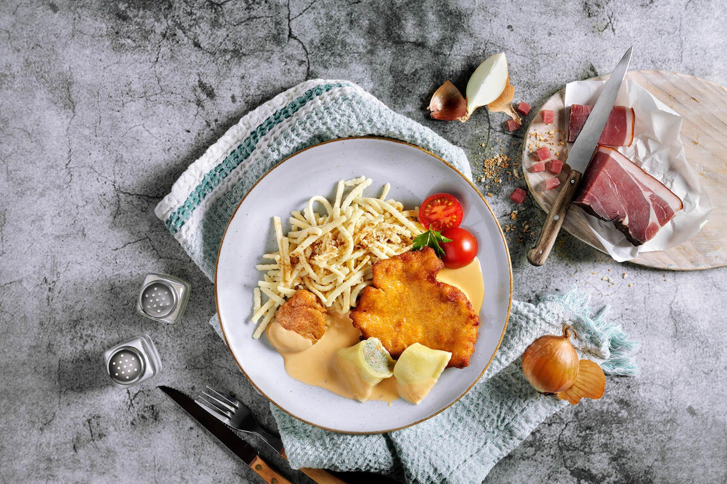 Spätzle gegart (Wasser, HARTWEIZENGRIEß, HÜHNEREI, Speisesalz), Wasser, Schweinefleisch (10%), Maultasche gegart (9%) (HARTWEIZENGRIEß, Schweinefleisch (25%), Wasser, Weißbrot (WEIZENMEHL, Wasser, Speisesalz, Hefe), Spinat, Speck, HÜHNEREI, Zwiebeln, Speisesalz, Petersilie, Traubenzucker, Stabilisator Natriumcitrate, Gewürze, Gewürzextrakte (enthält SELLERIE), Zucker), Schweinefilet (5%), Paniermehl (WEIZENMEHL, Hefe, Speisesalz, Gewürze), SAUERRAHM (4%), Rapsöl, Semmelbrösel (2%) (WEIZENMEHL, Wasser, Speisesalz, Zucker, Hefe), WEIZENMEHL, HÜHNEREI, jodiertes Speisesalz (Speisesalz, Kaliumjodat), modifizierte Stärke, Tomatenmark, durchwachsener Speck (Schweinefleisch, jodiertes Nitritpökelsalz (Speisesalz, Kaliumjodat, Konservierungsstoff Natriumnitrit), Glucosesirup, Antioxidationsmittel Natriumascorbat, natürliche Gewürzextrakte, Rauch), Zwiebeln, Zucker, SAHNE, Gemüsepulver (Zwiebeln, Pastinaken), Gewürze, Champignonextraktpulver (Maltodextrin, Champignonextrakt), Wein-Branntweinessig, Dextrose.