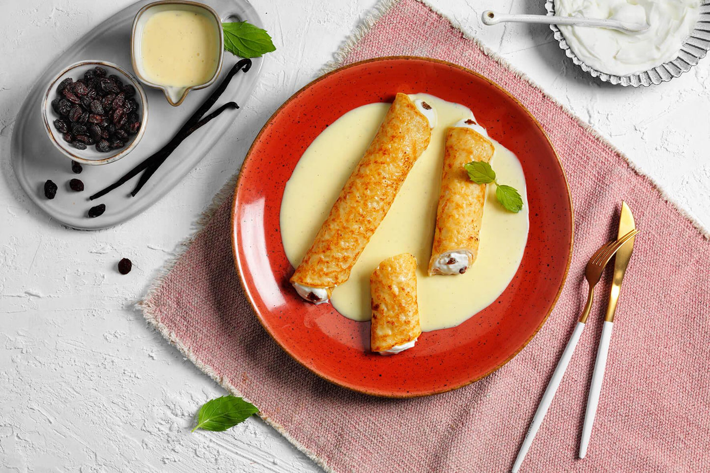 Bei dieser Variante der österreichischen Palatschinken haben wir uns bei Soße und Füllung für eine Innovation aus der HOFMANNs-Küche entschieden: Die zwei Topfenpalatschinken mit herrlich weichem, dünnen Teig haben wir mit einer köstlichen Quark-Rosinenfüllung versehen, die Dir einen fluffig-süßen Dessertgenuss beschert. Dazu reichen wir unsere hauseigene Vanillesoße für das gewisse Extra an Köstlichkeit!