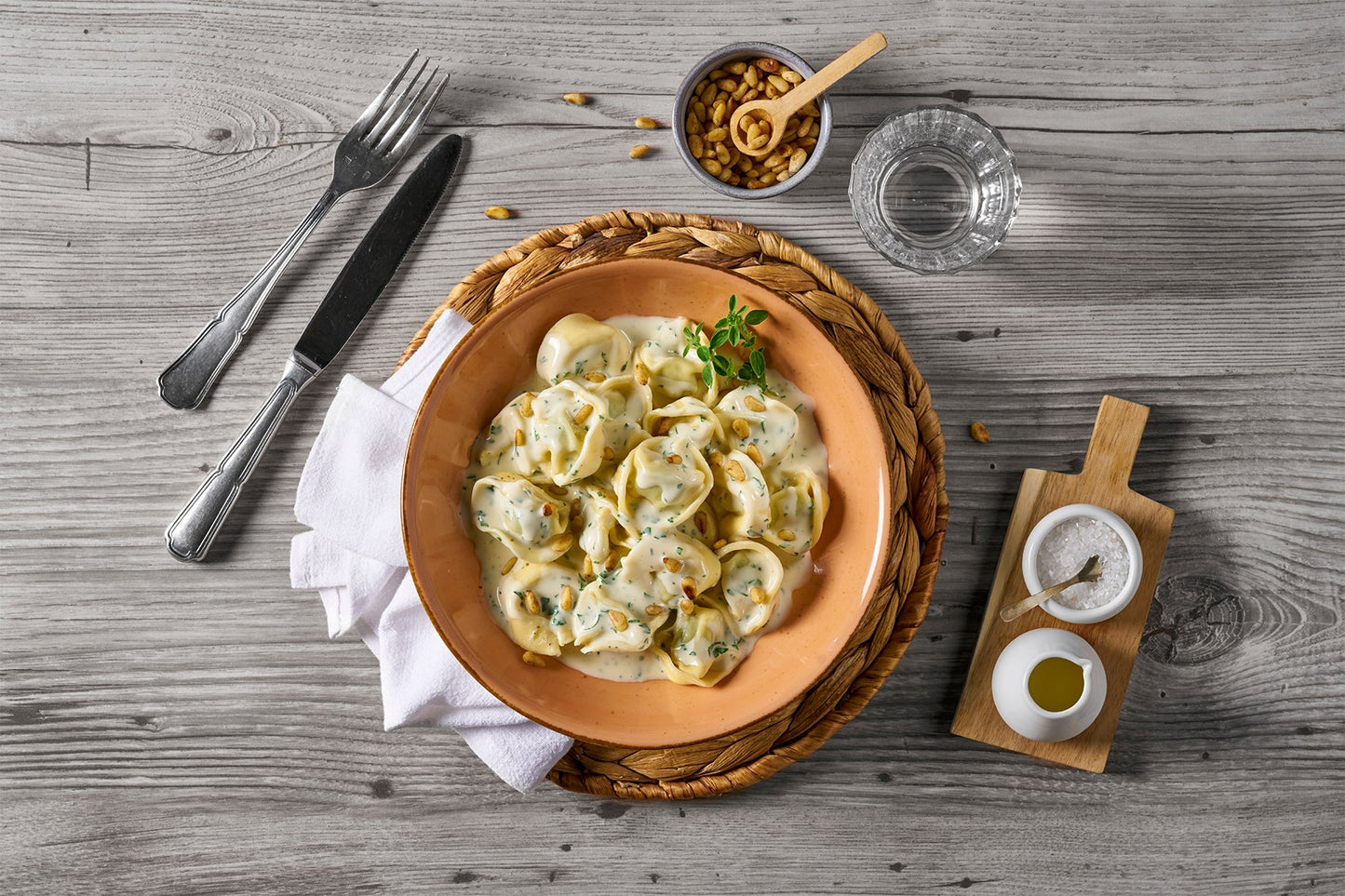 "Tortelloni mit Ricotta-Spinatfüllung gegart (HARTWEIZENGRIEß, Wasser, WEIZENMEHL, Spinat (5%), Ricotta (4%) (MOLKENEIWEIßKÄSE), HÜHNEREI, KÄSE, Speisesalz, Gewürze, Basilikum), Wasser, teilentrahmte MILCH, SAUERRAHM, SAHNE (6%), Rapsöl, WEIZENMEHL, Pinienkerne (1%), modifizierte Stärke, geriebener HARTKÄSE, jodiertes Speisesalz (Speisesalz, Kaliumjodat), Kräuter (1%), Knoblauch, Gewürze, Zucker, Dextrose. "