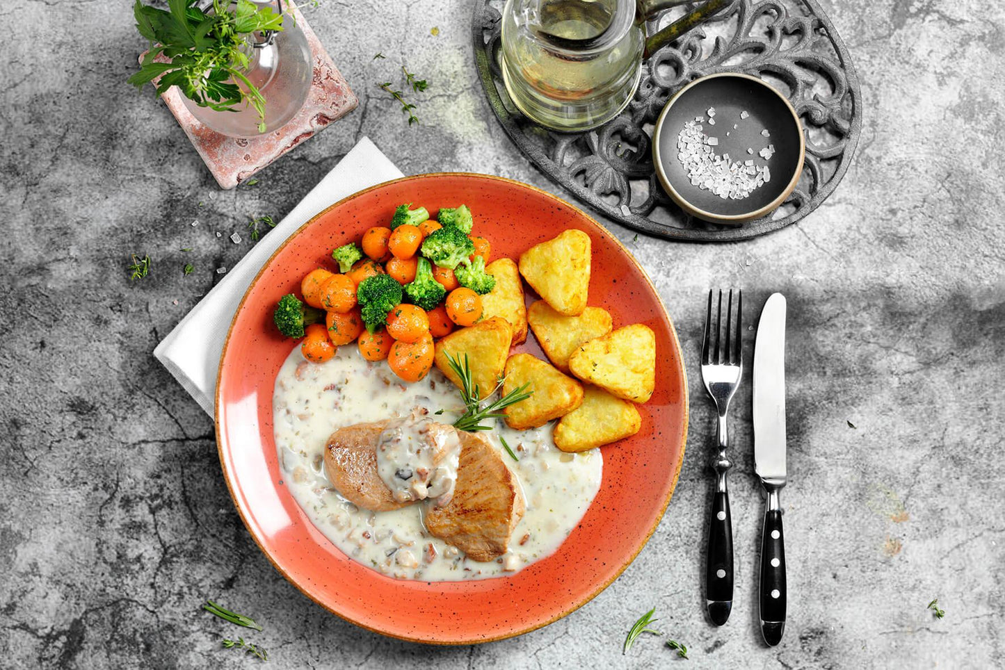 Eingebettet in eine milde Sahnesoße mit einer erlesenen Pilzauswahl und verfeinert mit Weißwein, wird Dir dieses Menü ein Lächeln ins Gesicht zaubern. Die exquisite Gemüsebeilage in Form glacierter Pariser Karotten und schmackhafter Broccoliröschen vollendet dieses Premiumgericht gemeinsam mit den knusprigen Röstiecken auf meisterhafte Weise.